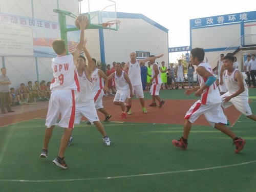 在此次的比賽中,參賽的單位有監理3標中企建發、1標中鐵十二局、4標四川場道、3標中國華西、5標上海路橋、8標中鐵航空港、10標中水十六局、6標甘肅機械化共8支籃球隊進行參賽,建設單位也派隊參加,進行友誼賽,我們跟兄弟單位中鐵航空港,上海路橋,中水十六局、四川場道一決高下,最后入圍四強,在決賽的比賽中,我們再次遇見實力強勁的中水十六局,雙方隊員在籃球比賽現場氣氛熱烈,隊員們積極進攻,嚴密防守,精彩的配合,巧妙的搶斷,不時的將比賽氣氛推向高潮。天氣雖然炎熱,但絲毫沒有影響隊員的熱情,盡管兩支球隊都是業余籃球愛好者,但他們在比賽中均表現出較好的團隊協作能力,一群年輕人激情飛揚,帶球、傳球、搶斷、上籃,賽場對抗激烈,隊員個個揮汗如雨,最后在我方隊員的努力拼搏下,以32:30的比分,贏得第一。