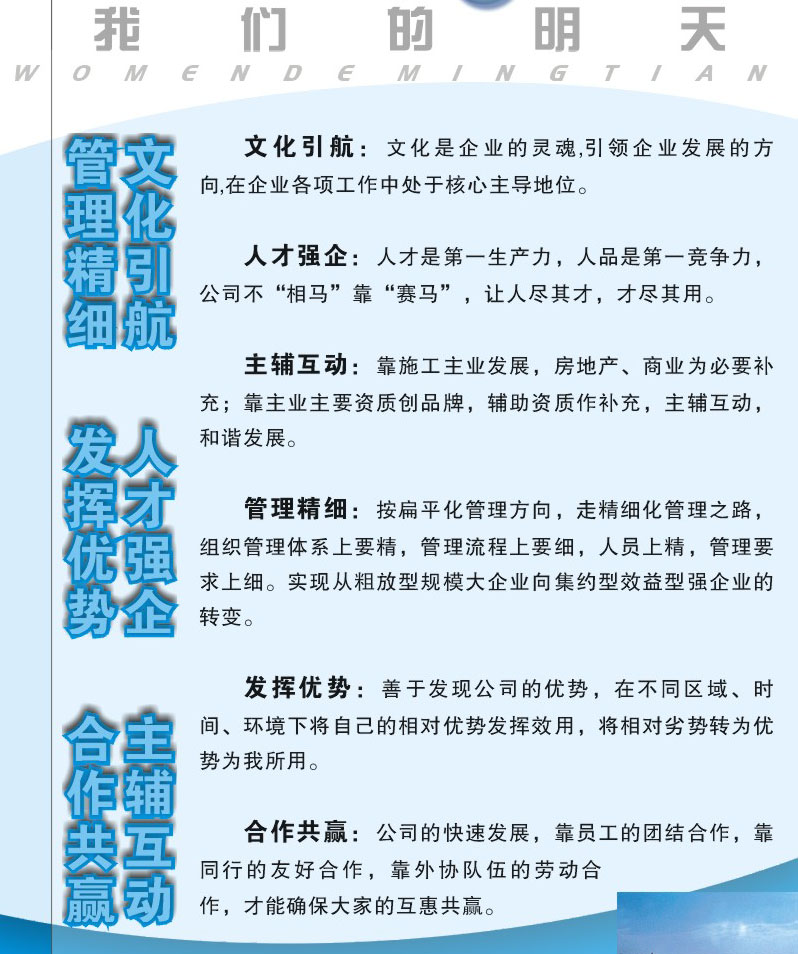 3、企業文化是公司持續發展的迫切需要,是公司樹形象、創品牌、提升知名度的必要手段,是公司思想政治工作發揮作用的載體。