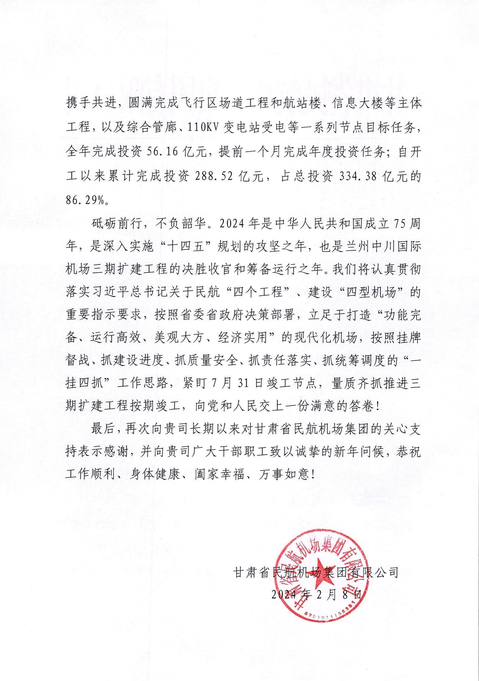 最后,甘肅省民航機場集團有限公司再次向我司長期以來對甘肅省民航機場集團的關心支持表示感謝,并向我司廣大干部職工致以誠摯的新年問候!