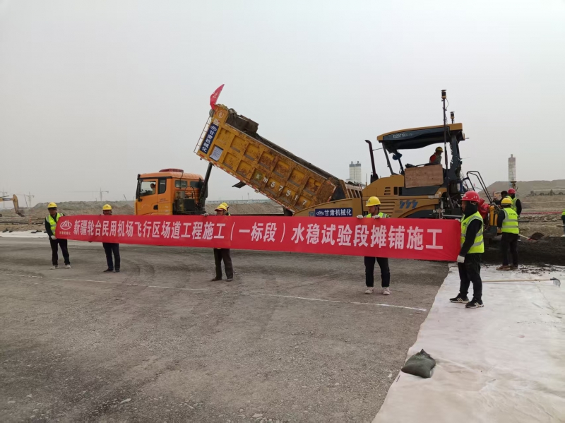 3月27日,新疆輪臺民用機場項目現場,隨著首車水泥穩定砂礫混合料倒入攤鋪機,其緩緩啟動,我司承建的該項目飛行區場道工程(一標段)水穩基層施工正式開啟。