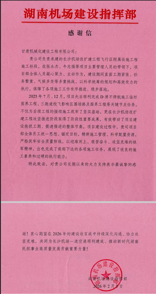 兩封感謝信,既是對項目團隊攻堅克難、實干擔當的充分肯定,更是對我司綜合實力與專業能力的高度認可。我司將以兩大機場項目為新起點,持續深化合作、精益求精,以更高標準完成各項工程任務,為民航及基礎設施建設事業再立新功。